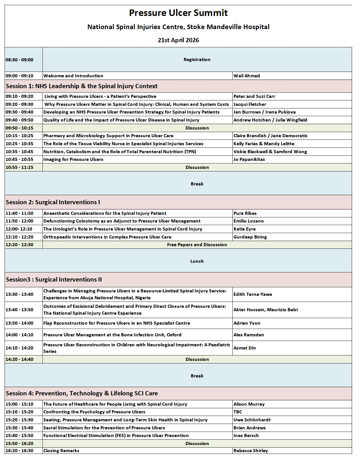 Abstracts are welcomed from all disciplines involved in pressure ulcer care, including (but not limited to) plastic and reconstructive surgery, spinal injury care, nursing, tissue viability, rehabilitation, geriatrics, orthopaedics, podiatry, physiotherapy, occupational therapy, and allied health professionals. Submissions may include clinical research, audit, quality improvement projects, service innovations, educational initiatives, or translational science relevant to pressure ulcer care.